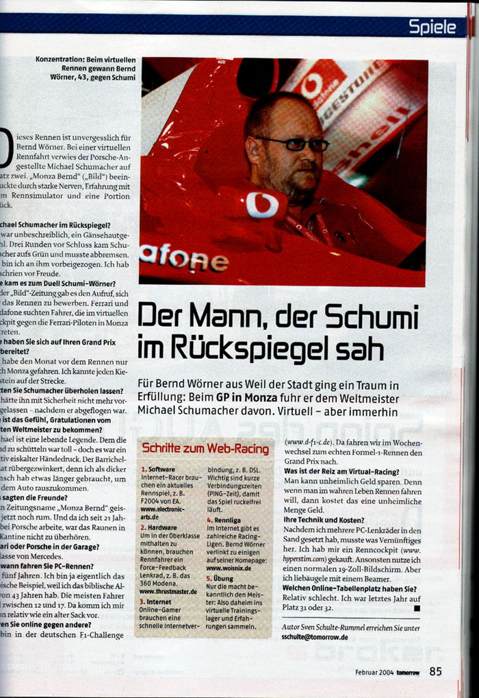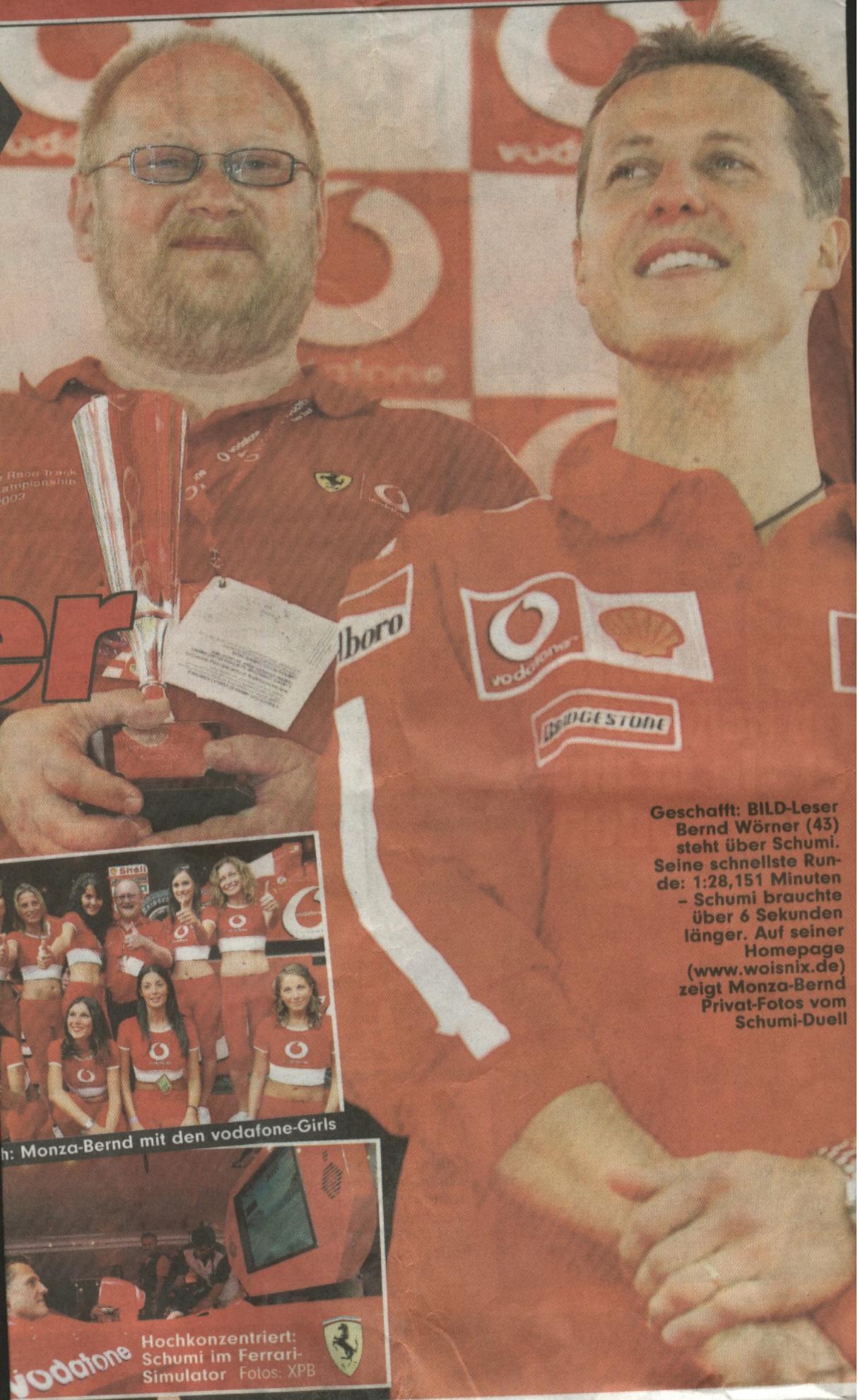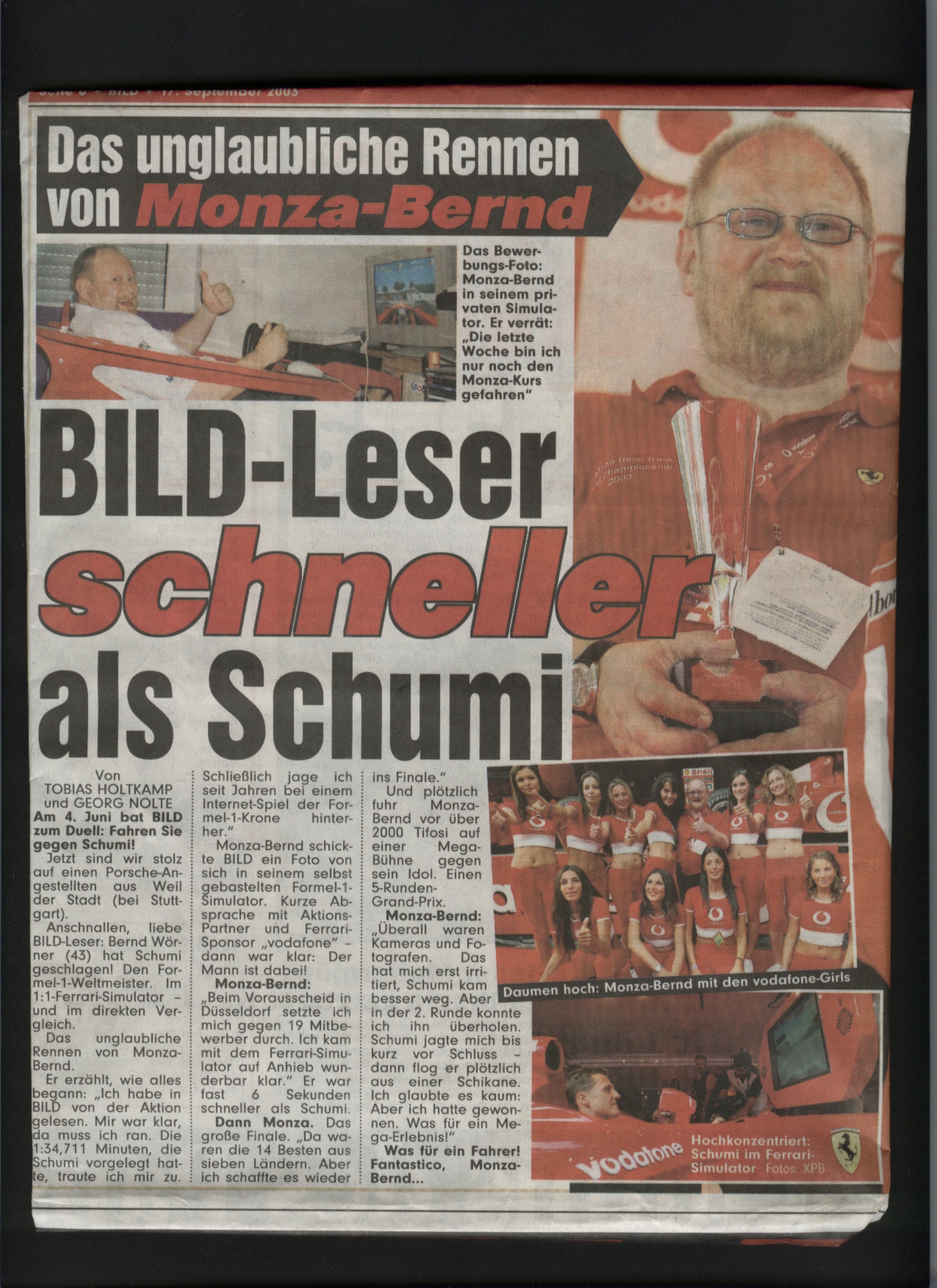 Am 17.09.2003 berichtete die Bildzeitung über meinen Erfolg in Monza und widmete mir eine halbe Seite. |